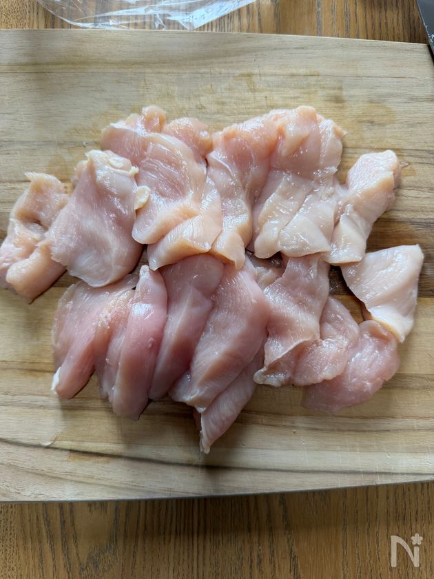 (下準備) むね肉は1cm幅のそぎ切りにする。