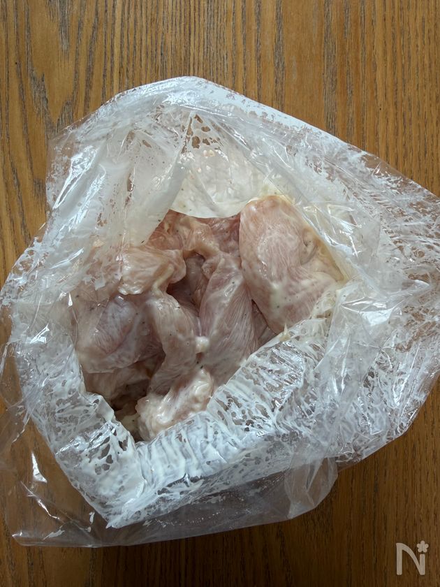 (1) ポリ袋にむね肉、塩こしょう、マヨネーズ、片栗粉を入れたらしっかりと揉み込む。