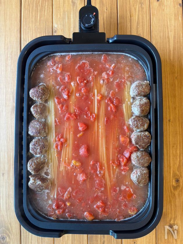 (3) ミートボールを端に寄せ、【B】を加えて、スパゲッティに水分が馴染むように軽く混ぜる。温度調節ダイヤルを240に設定して、ふたをし、スパゲッティの袋の表記時間より2分長く加熱する。