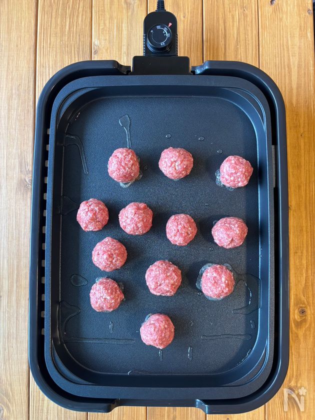 (2) 温度調節ダイヤルを140に設定し、サラダ油を広げる。1を並べ、返しながら焼き色がつくまで焼く。