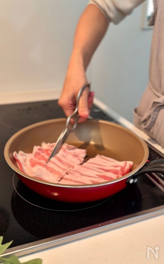 (1) 豚バラ薄切り肉は、パックのままフライパンにひっくり返し、キッチンバサミで食べやすい大きさに切る。