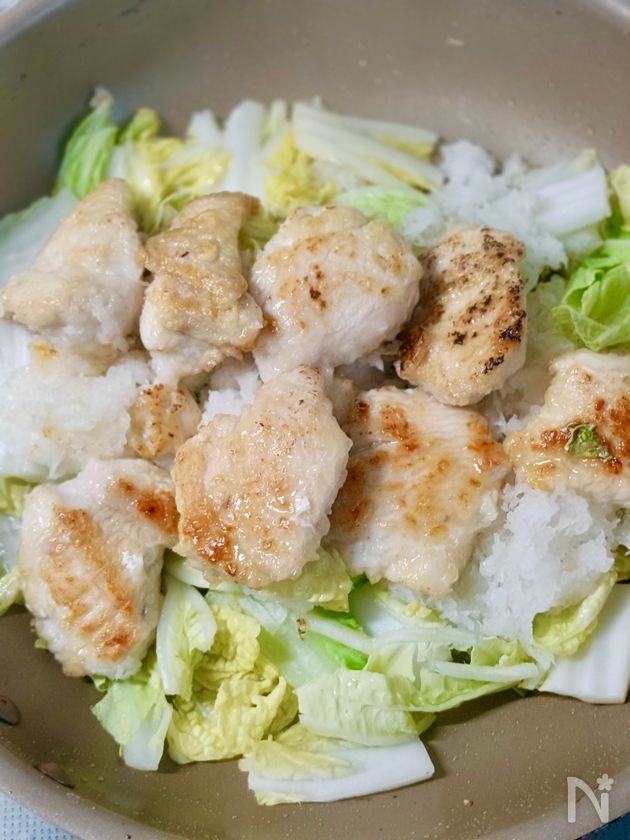 1食140円♡ワンパン♩白菜と鶏胸肉のおろしぽん酢煮