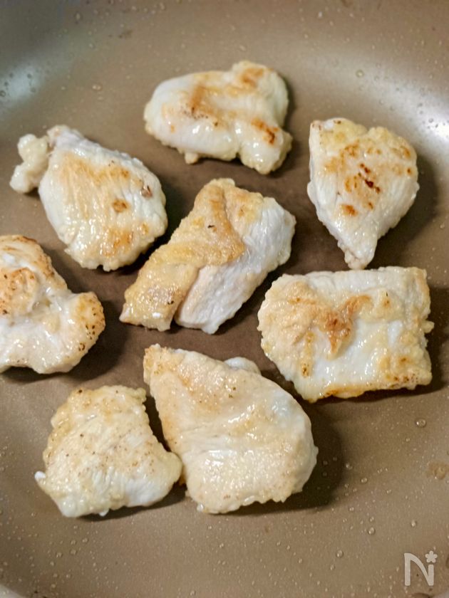 (1) 鶏胸肉はそぎ切りにし、すりおろし生姜小さじ1を和えて、片栗粉大さじ1.5をまぶす。フライパンに油大さじ1入れて中火で熱し、鶏胸肉を両面焼く。