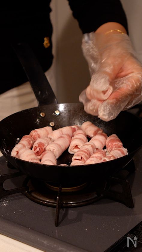 フライパンに豚バラ肉を広げ、片栗粉をまぶしながら、くるくると巻いていく。巻き終わりはギュッと押さえて、形を崩れにくくする。
