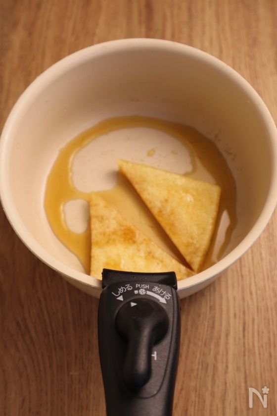 (1) 鍋に【A】を入れ、煮立たせたら、斜めに切った油揚げを入れて汁気がなくなるまで煮る。一旦取り出しておく。