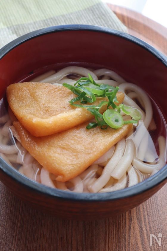 (3) 器にうどんを入れ、その上に②をかけたら油揚げを乗せ、刻みネギを散らす。