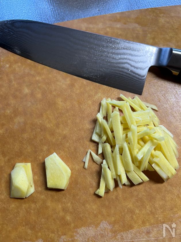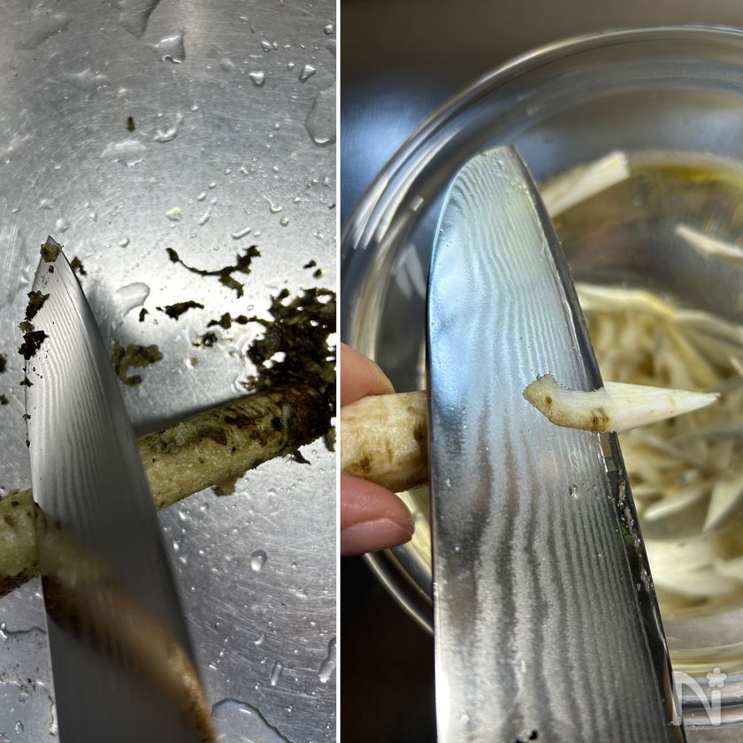 そのまま水を張ったボウルに落としていくとアク抜きも同時に終わります。