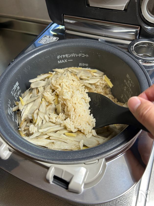 (5) 炊き上がったらしゃもじで下からすくい上げるように混ぜる。