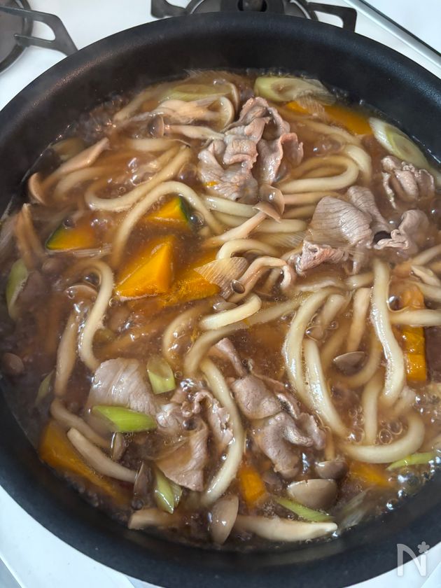 (3) 解凍した冷凍うどんを入れてさらに5分煮込む。