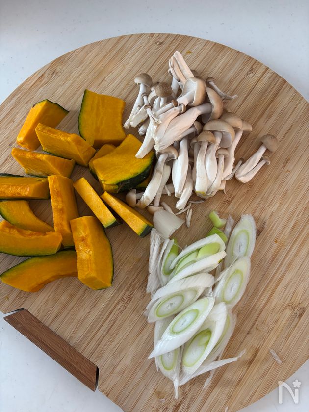 (1) かぼちゃと長ねぎは5mm幅の薄切りにする。しめじはほぐしておく。