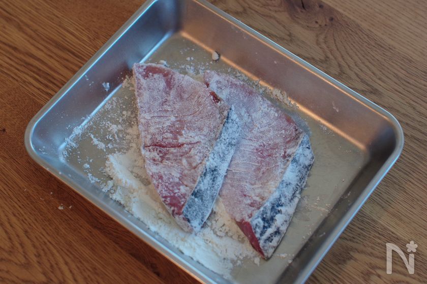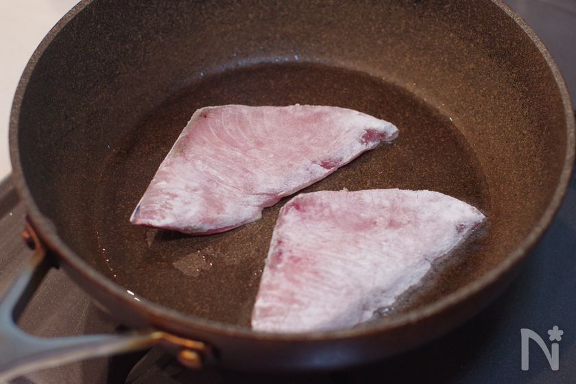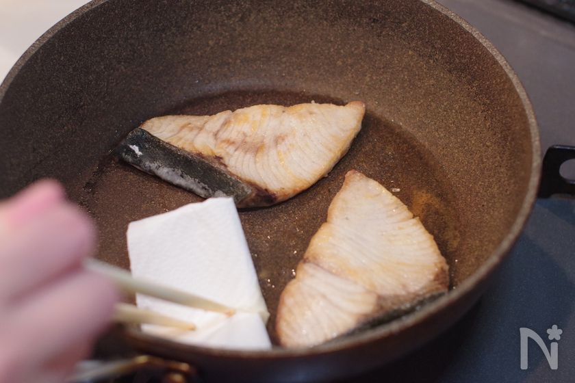 (2) フライパンに油をひき、ぶりの切り身を皮目から焼く。(弱火で3分)