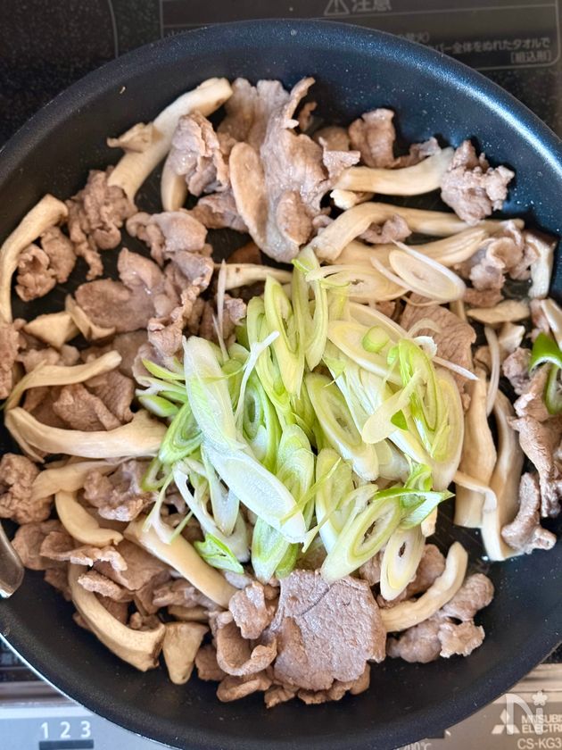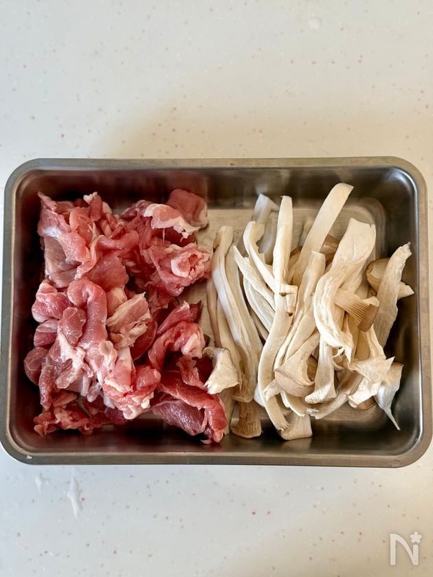 (下準備) エリンギは縦に手で裂く。豚こまは大きいものは食べやすい大きさに切る。長ねぎは斜め薄切りにする。