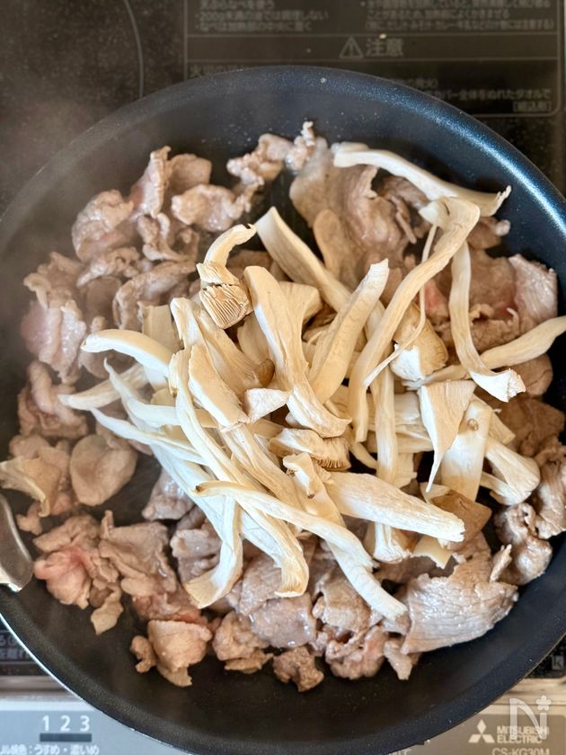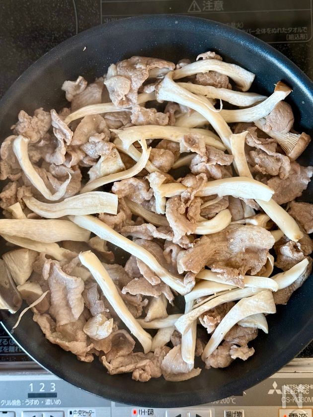 (1) フライパンに油(分量外)を入れ、豚こまを炒める。色が変わってきたらエリンギを加える。