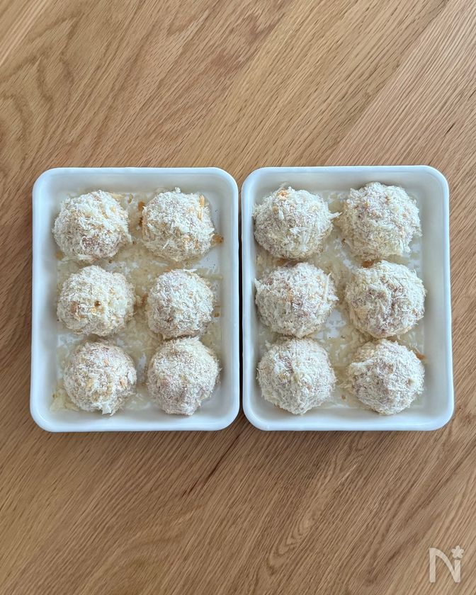 (3) 12等分にタネを分け、真ん中にキャンディチーズを入れて丸く成型する。冷蔵庫で30分休ませる。