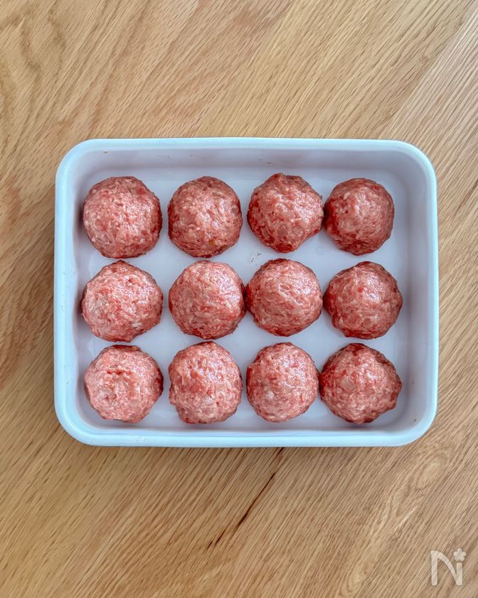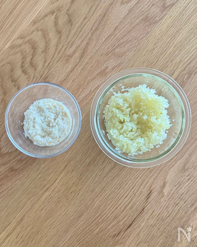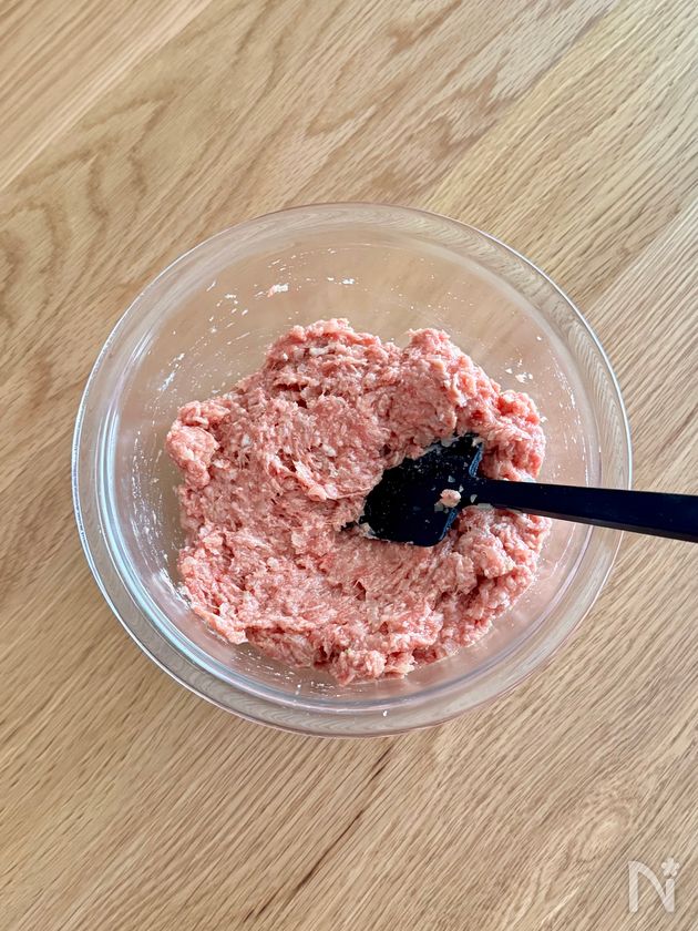 (1) 玉ねぎはみじん切りにし、600Wのレンジで2〜3分加熱して粗熱を取る。パン粉を牛乳に浸しておく。