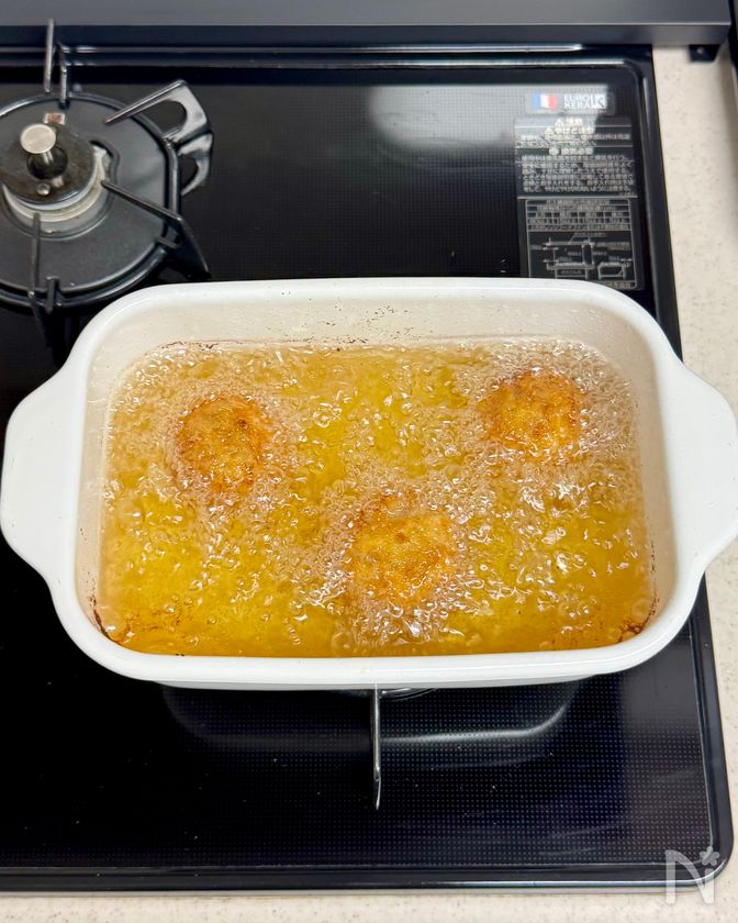 ・パン粉付けしたタネを一旦冷蔵庫で冷やし、揚げる直前に成型し直してから揚げ始めると、キレイな仕上がりになります。
