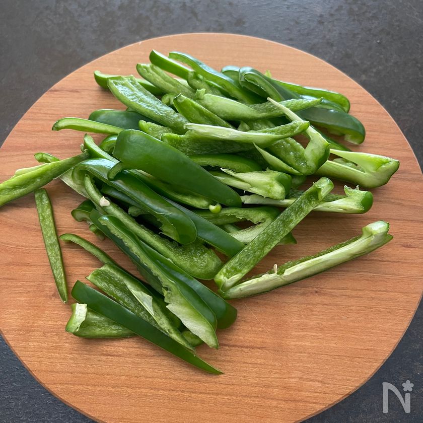 (3) 油を引いたフライパンで鶏むね肉を焼き、火が通ったらピーマンと【A】を加えてさっと炒める。