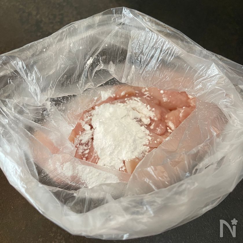 (2) 皮を取って細切りにした鶏むね肉に酒を揉み込み、片栗粉をまぶす。