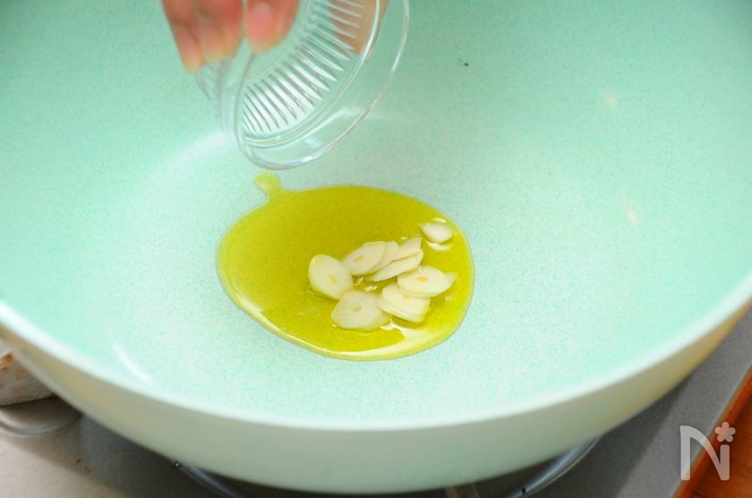(3) 鍋にニンニクとオリーブオイルを入れて火にかけます。