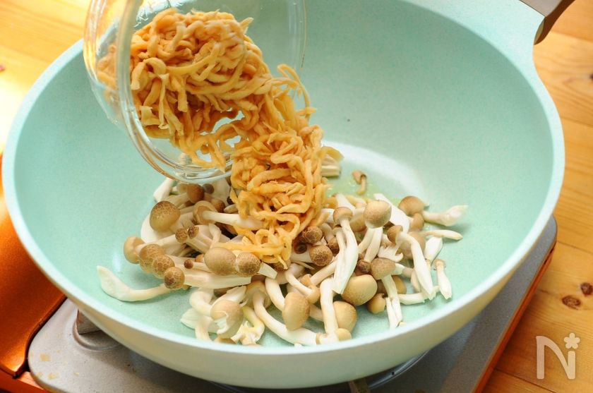 (4) にんにくのいい香りがして来たら、切り干し大根、シメジを加えて炒めます。