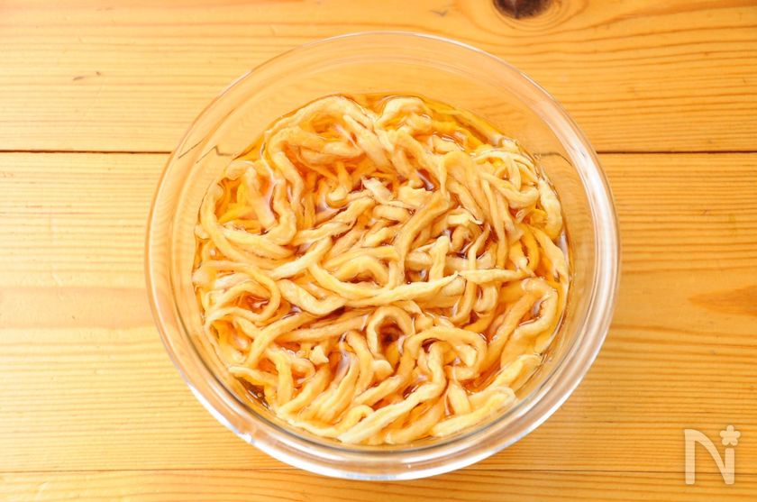 (1) 切り干し大根はぬるま湯でもどしておきます。