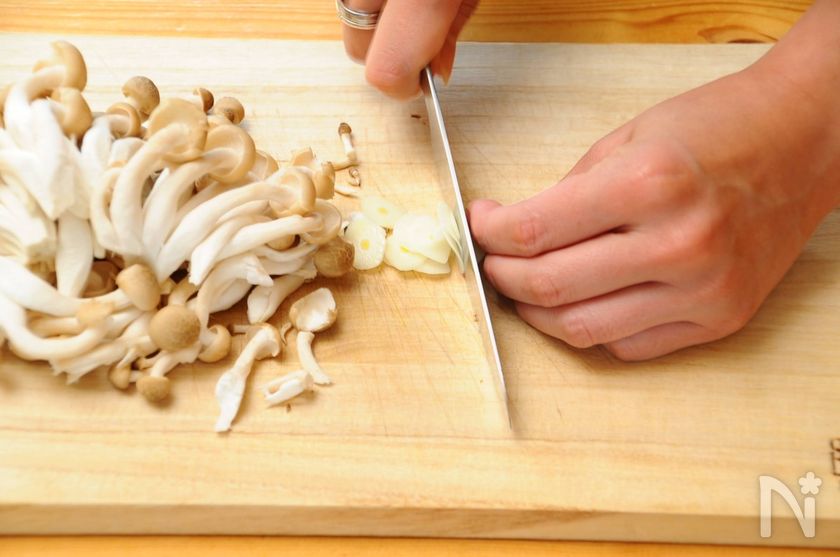(2) しめじは石突きをとってほぐして、ニンニクはスライスします。