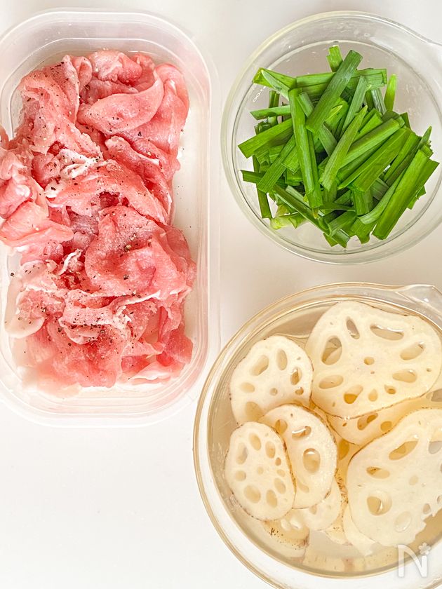 れんこんは4〜5mm幅の輪切りにして水にさらす。