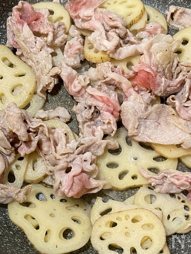 (2) フライパンにごま油を熱し、豚肉、れんこんを炒める。
