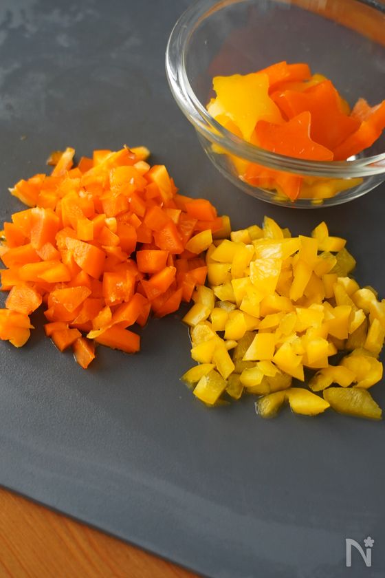 (1) パプリカ(赤・黄)は飾り用にお好みの数、星型にくり抜き、残りはみじん切りにする。玉ねぎ、にんにくはみじん切りにする。ブロッコリーは食べやすい大きさに切る。