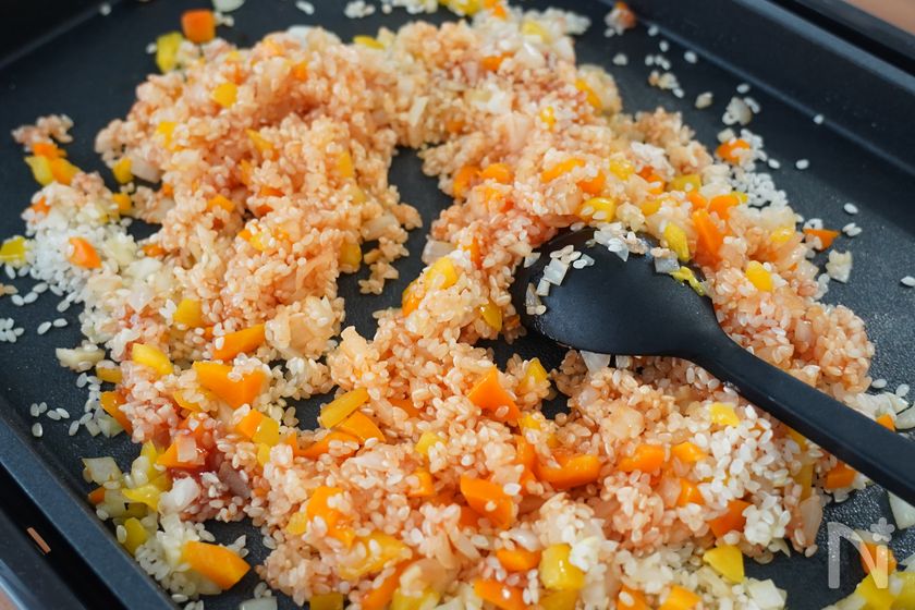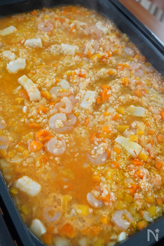 (3) ホットプレートにオリーブオイルを入れ、にんにく、みじん切りにしたパプリカ、玉ねぎを炒める。玉ねぎが透き通ってきたら、【A】を加えて混ぜ、米は洗わずに加え、さらに3~4分炒める。