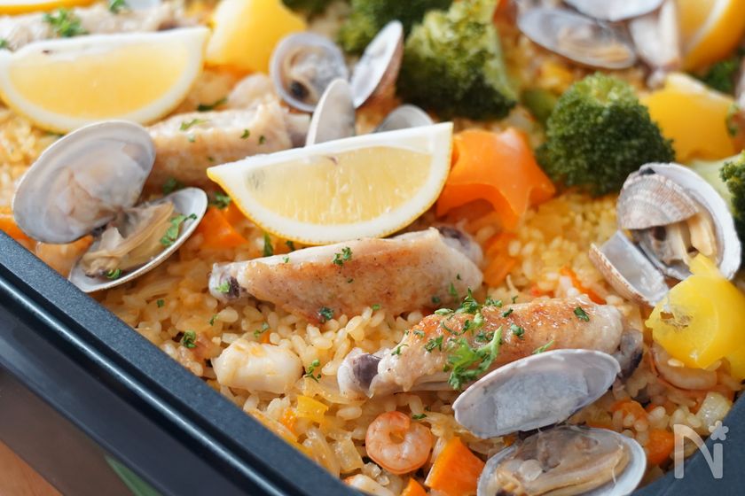 (5) 平らにならしたら、あさり(殻つき)、ブロッコリー、2の手羽中を並べ、ふたをして15分加熱する。