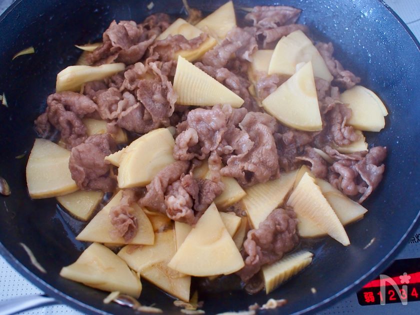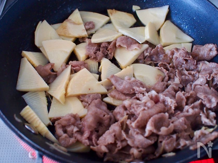(3) 牛肉の色が変わったら端に寄せ、ゆでたけのこを加えたら、少し焼き色がつくように炒める。