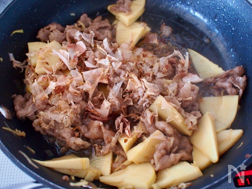 (4) たけのこに軽く焼き色がついたら、【A】を加え、汁気がほぼなくなるまで炒め合わせる。