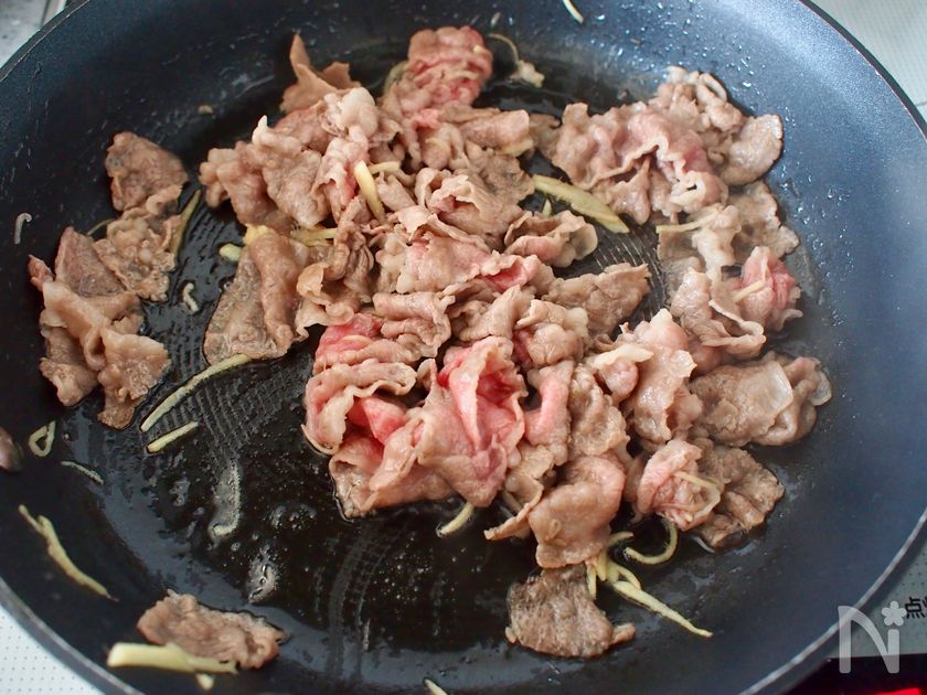 (2) フライパンにごま油を中火で熱し、しょうがを加え、香りが立ってきたら牛切り落とし肉を入れて炒める。