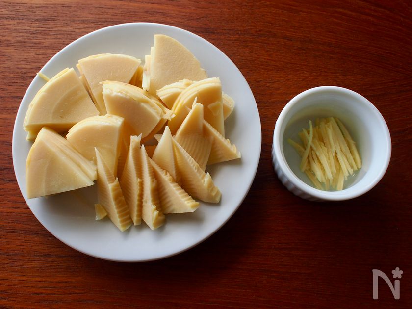 (1) ゆでたけのこは根元と穂先に切り分け、根元は厚さ5mmのいちょう切り、穂先は縦半分に切ってから縦に幅5mmに切る。