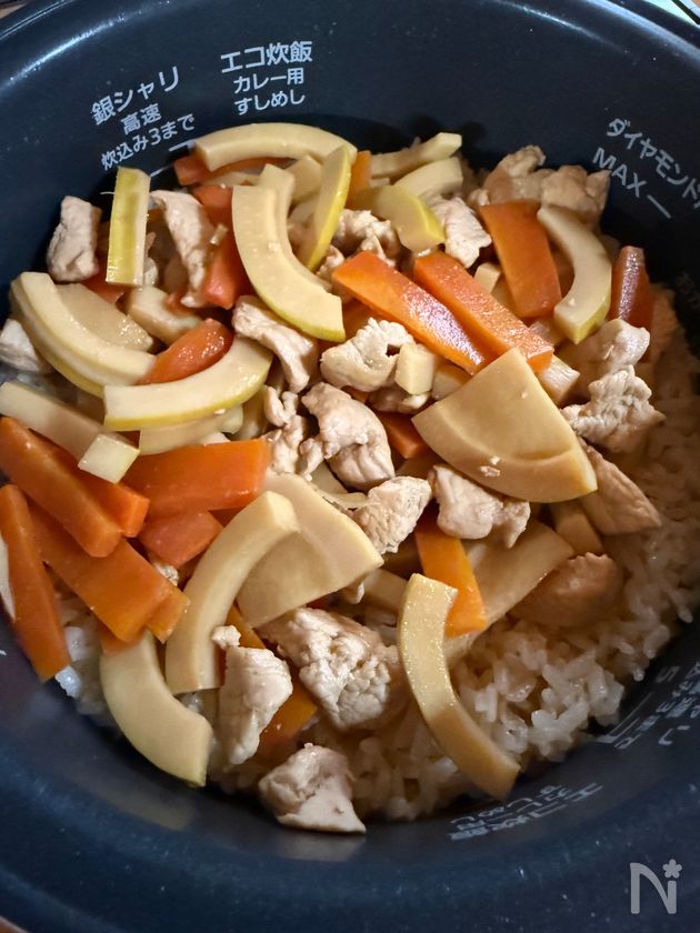 炊飯器のスイッチが切れたら具をまんべんなく広げてのせてから蒸らすと、余熱で野菜と鶏肉にしっかり味が染み込みます。