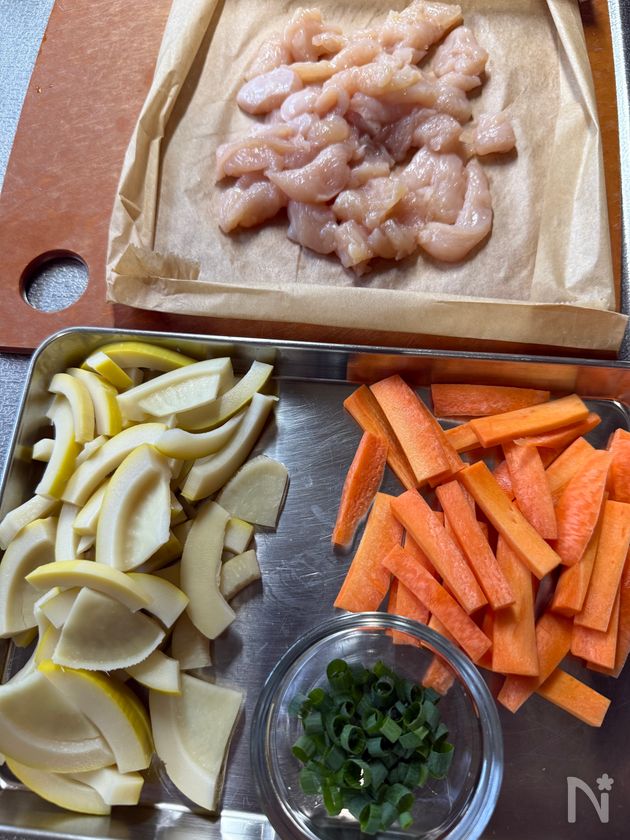 (1) たけのこ水煮は1cm幅に切る。にんじんは短冊切りにする。鶏むね肉は皮を除き1cm四方の大きさに切る。小ねぎは小口切りにする。
