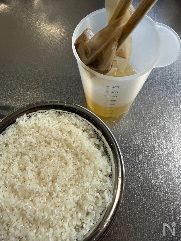 (下準備) 米はといでざるに上げておく。