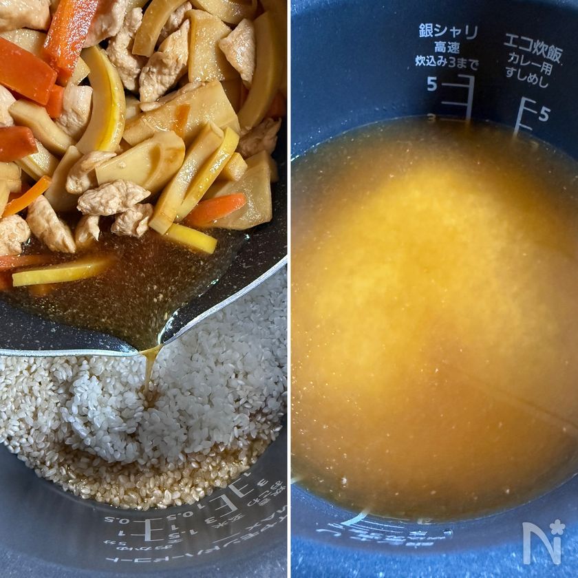 (4) 炊飯器の内釜に米を入れ、3の煮汁のみ加える。内釜の3合の目盛りまで水(分量外)を足し、ひと混ぜしたらスイッチを入れる。