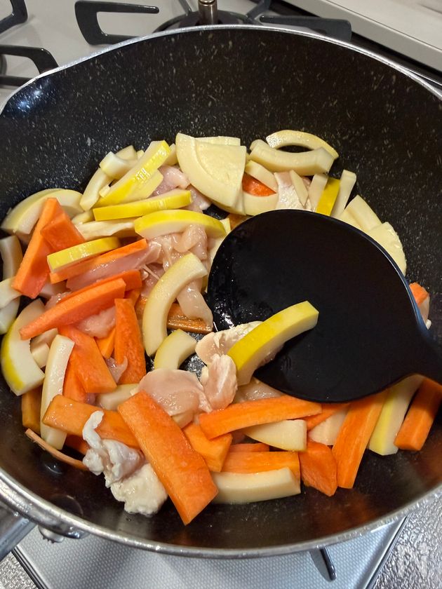 (2) 米油(サラダ油)を入れた鍋にたけのこ、にんじん、鶏肉を入れて中火で炒める。