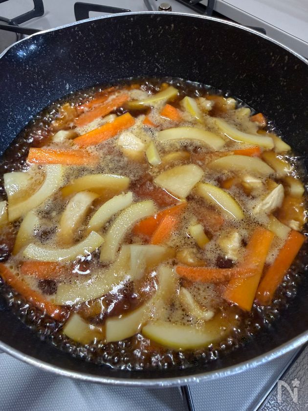 (3) 全体に油が回ったら【A】を加え、中火でひと煮立ちさせる。弱めの中火で5分ほど煮て火からおろし、粗熱をとる。