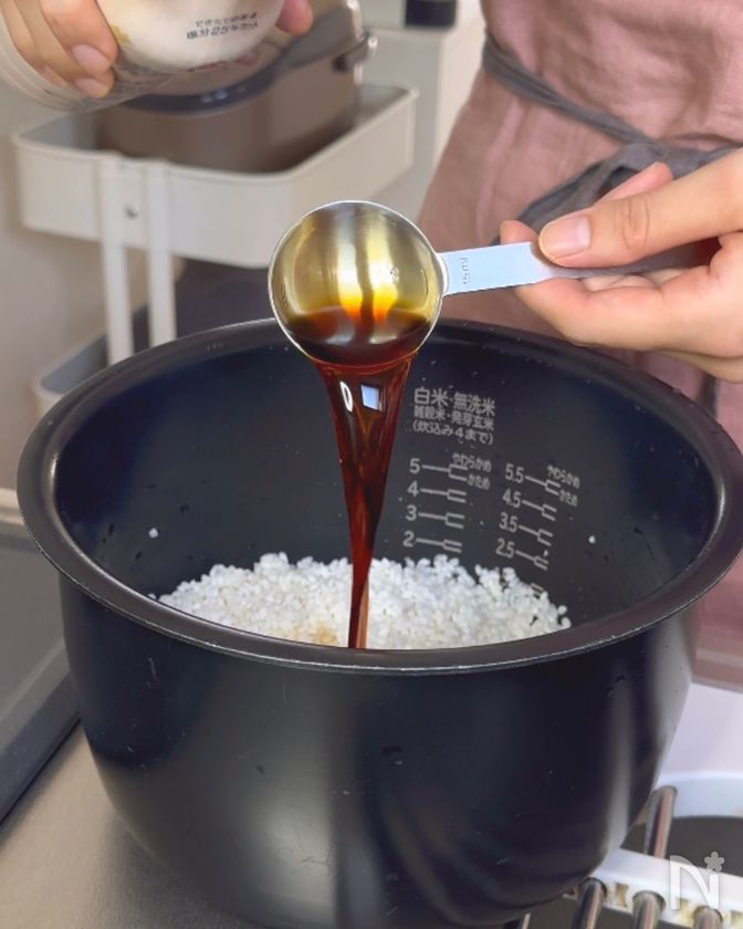 (1) 炊飯器に研いだ米、【A】を入れ、水を2合の目盛りまで注ぐ。