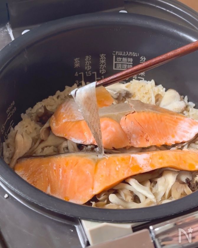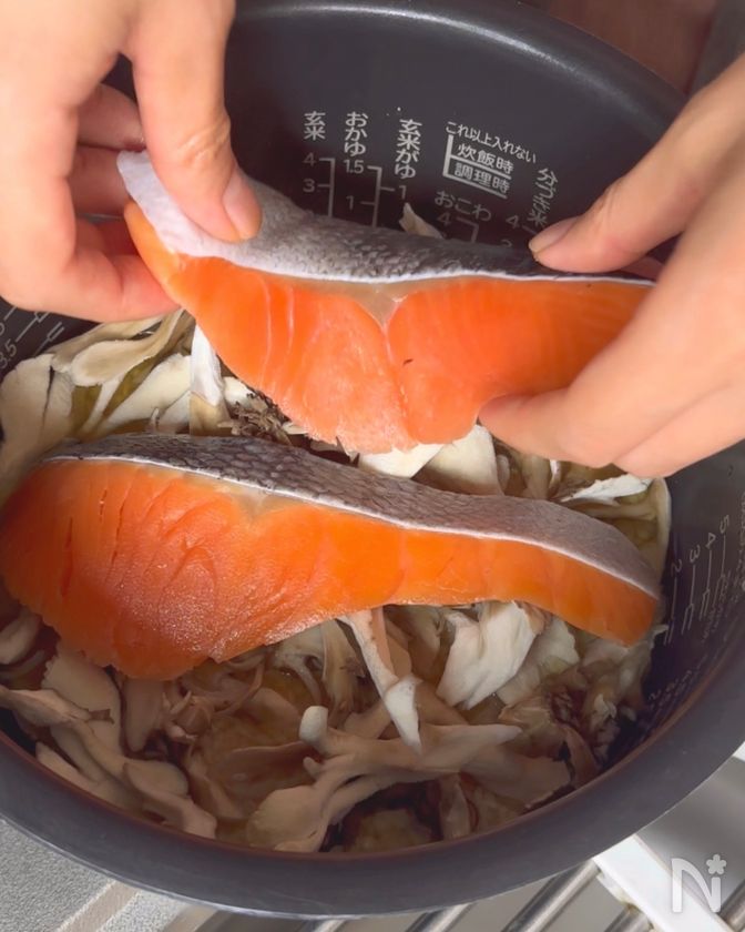 (2) 食べやすいように手でほぐした舞茸、生鮭をのせて、通常モードで炊飯する。