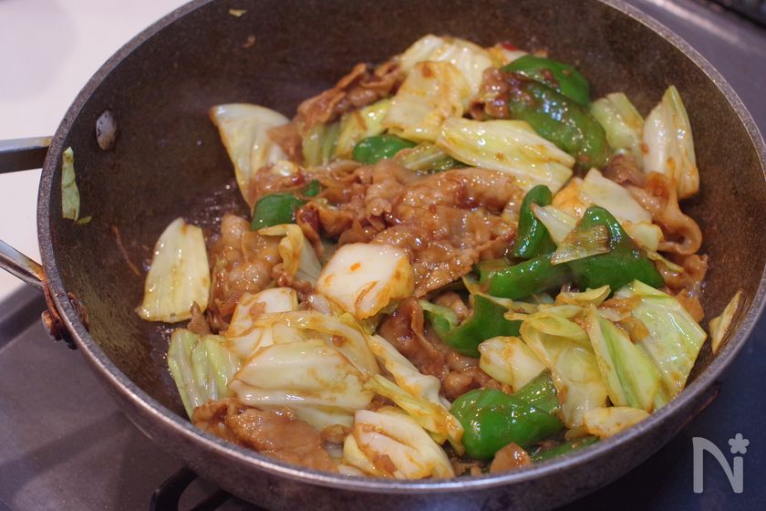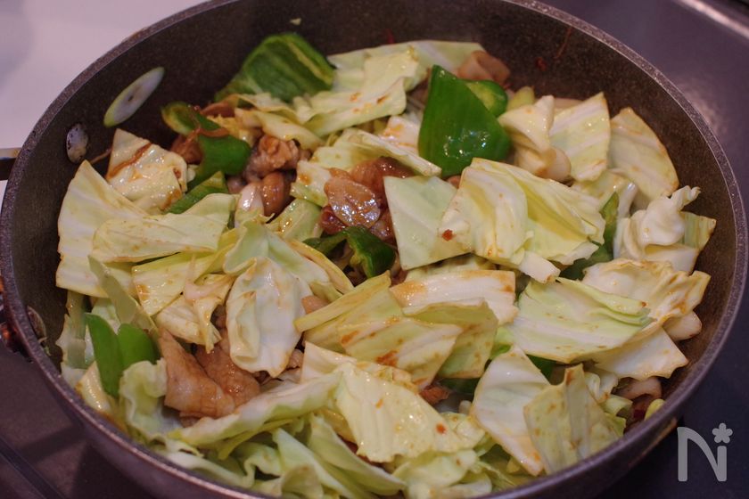 (4) 豚肉に味噌タレが絡んだらキャベツ、ピーマン、長ネギを加え2分炒める。弱火にして蓋をして3分蒸し焼きにする。