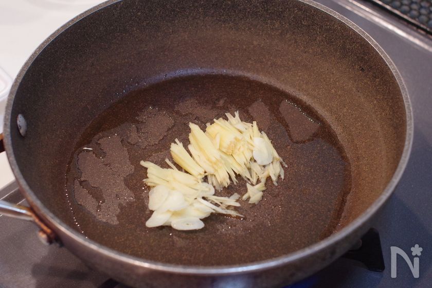 (2) フライパンにごま油をひいて中火で熱し、生姜、にんにくを炒める。香りがたったら豚バラ肉を加え炒める。
