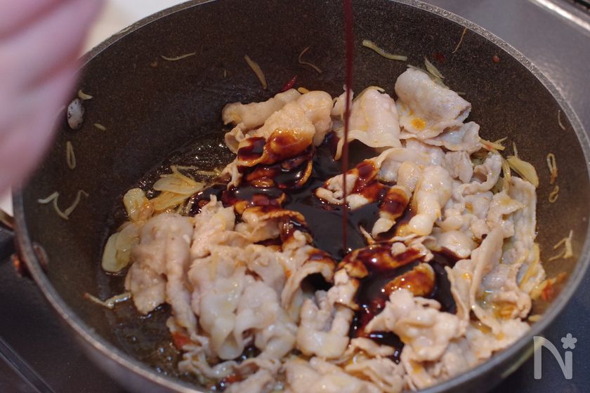(3) 豚バラ肉に半分くらい火が通ったら豆板醤を加えさっと炒め、香りがたったら【A】を加え炒める。