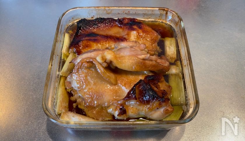 (2) 鶏肉の下にねぎを入れ、皮目を下にしてフタをずらしてのせ、600wの電子レンジで6分加熱する。裏返して、フタをせず4分加熱する。