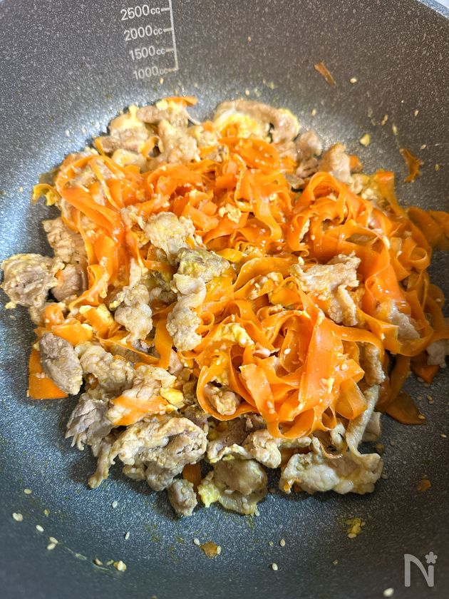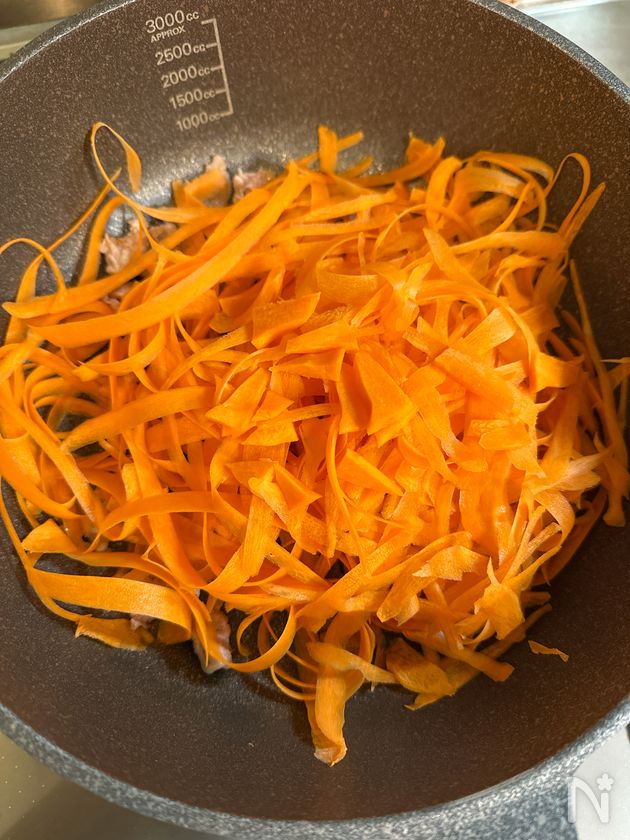 色が変わったら火を止めて、にんじんをピーラーでスライスし、中火で熱し炒める。