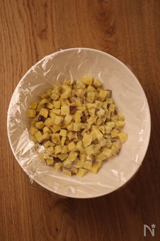 (1) 耐熱容器にさつまいもダイスカットを入れ、ラップをかけたら600wで7分レンチンする。