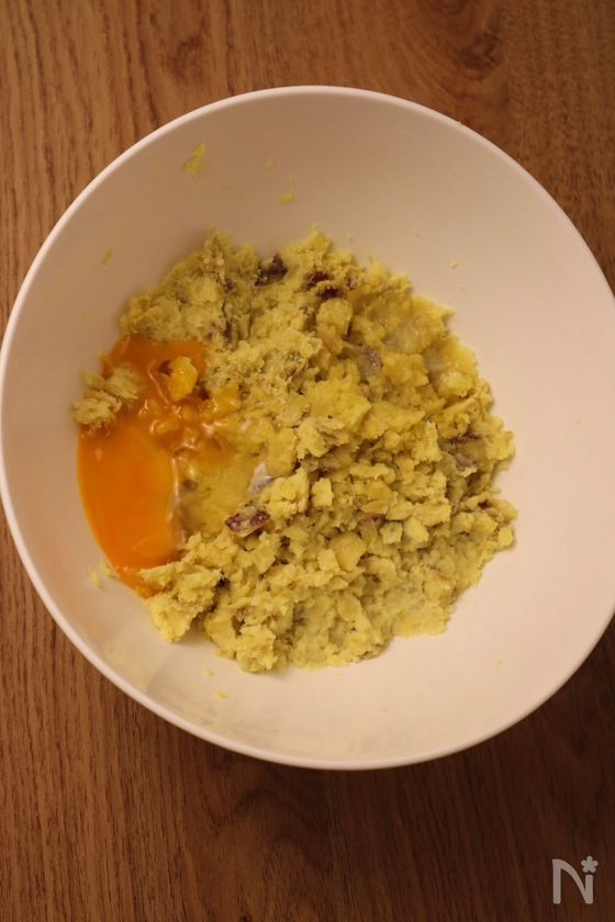 (5) 形成したさつまいも生地の表面に、ハケまたはスプーンの背で卵黄(焼き色用)を薄く塗る。